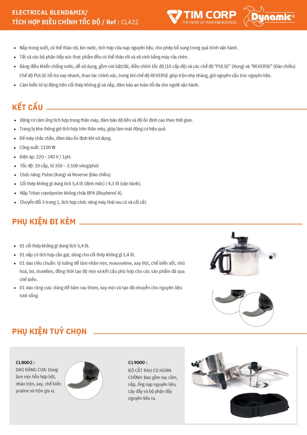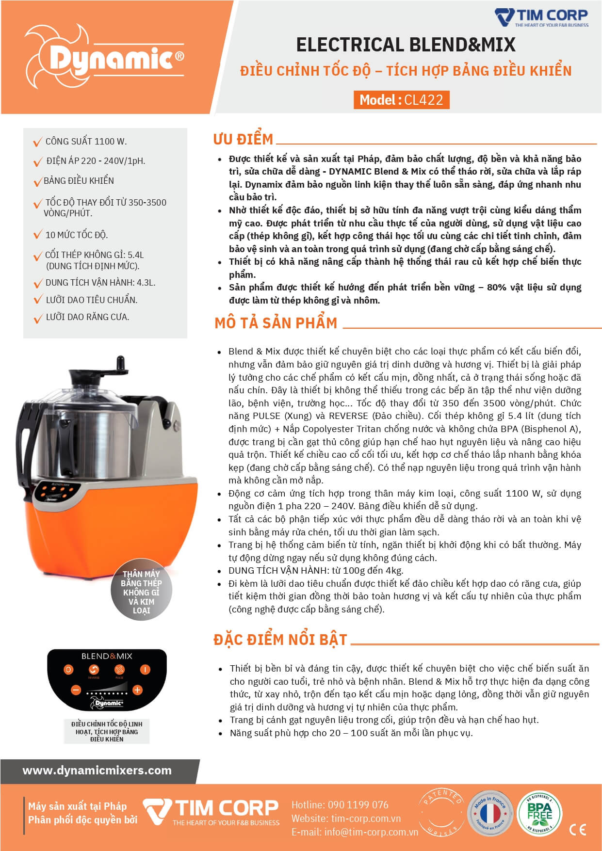 DYNAMIC BLEND & MIX là thiết bị xay – trộn đa năng công nghiệp, tích hợp cả chức năng Food Processor / Vegetable Slicer, được thiết kế dành riêng cho các bếp chuyên nghiệp cần xử lý thực phẩm mềm, mịn và đồng nhất.