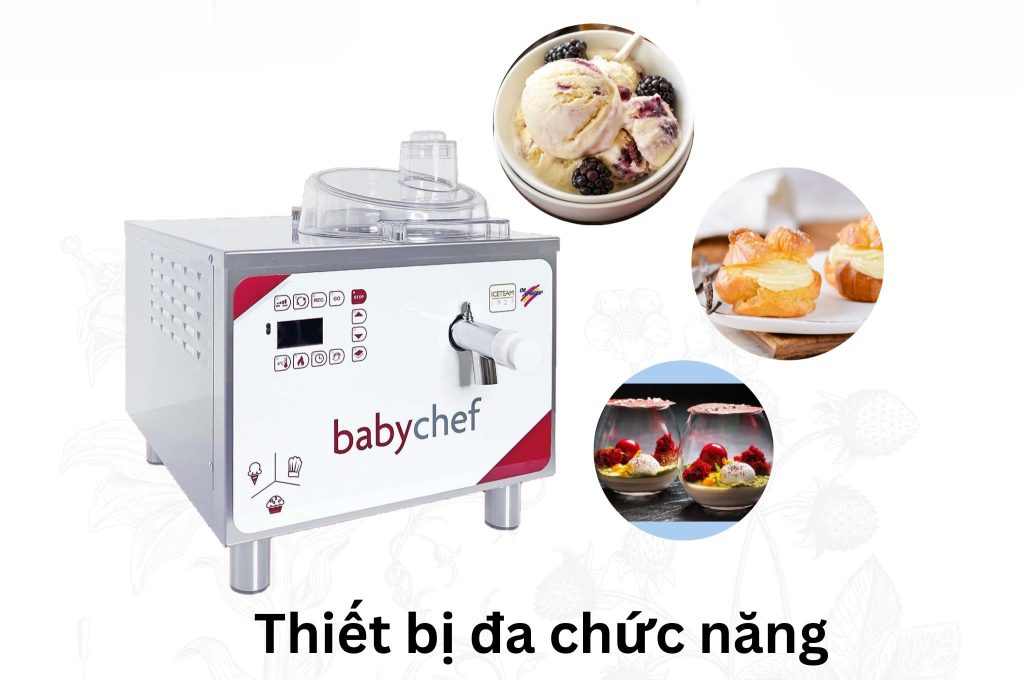 Thiết bị cũng tối ưu chi phí đầu tư nhờ khả năng thay thế cả máy thanh trùng và máy cấp đông riêng biệt. Đồng thời, Baby Chef cho phép đa dạng hóa menu từ các món tráng miệng lạnh đến sốt nóng và custard.